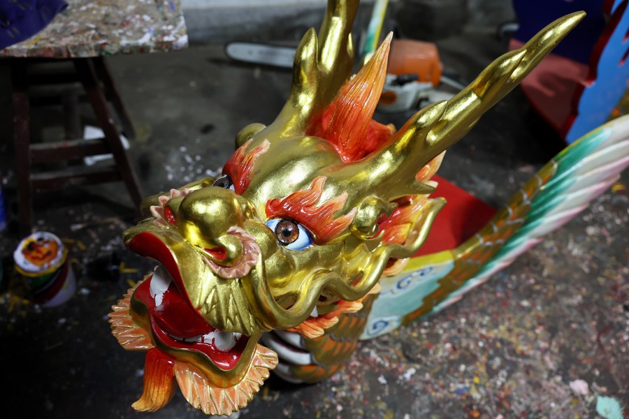 Photo taken on May 30, 2022 shows a newly carved lacquered dragon head for a dragon boat in Fangzhuang Village of Nantong Township in Minhou County of Fuzhou, southeast China's Fujian Province. (Xinhua/Jiang Kehong)
