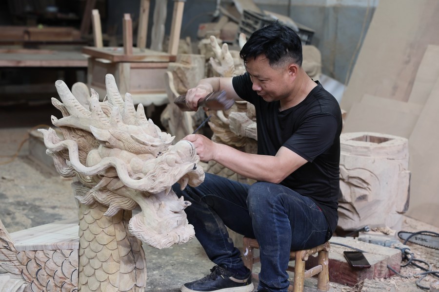 Craftsman Fang Xiaoshui carves the dragon head for a dragon boat in Fangzhuang Village of Nantong Township in Minhou County of Fuzhou, southeast China's Fujian Province, May 30, 2022. (Xinhua/Jiang Kehong)