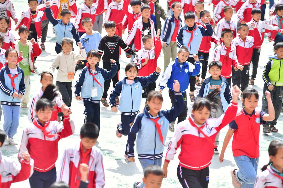 Children take exercise in Sanzhiyang Elementary School in Du'an Yao Autonomous County, south China's Guangxi Zhuang Autonomous Region, May 18, 2022. (Xinhua/Huang Xiaobang)