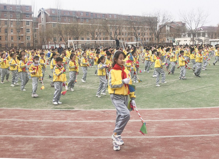 Students exercise at No. 23 primary school of Xingqing District of Yinchuan, northwest China's Ningxia Hui Autonomous Region, March 25, 2022. (Xinhua/Ai Fumei)