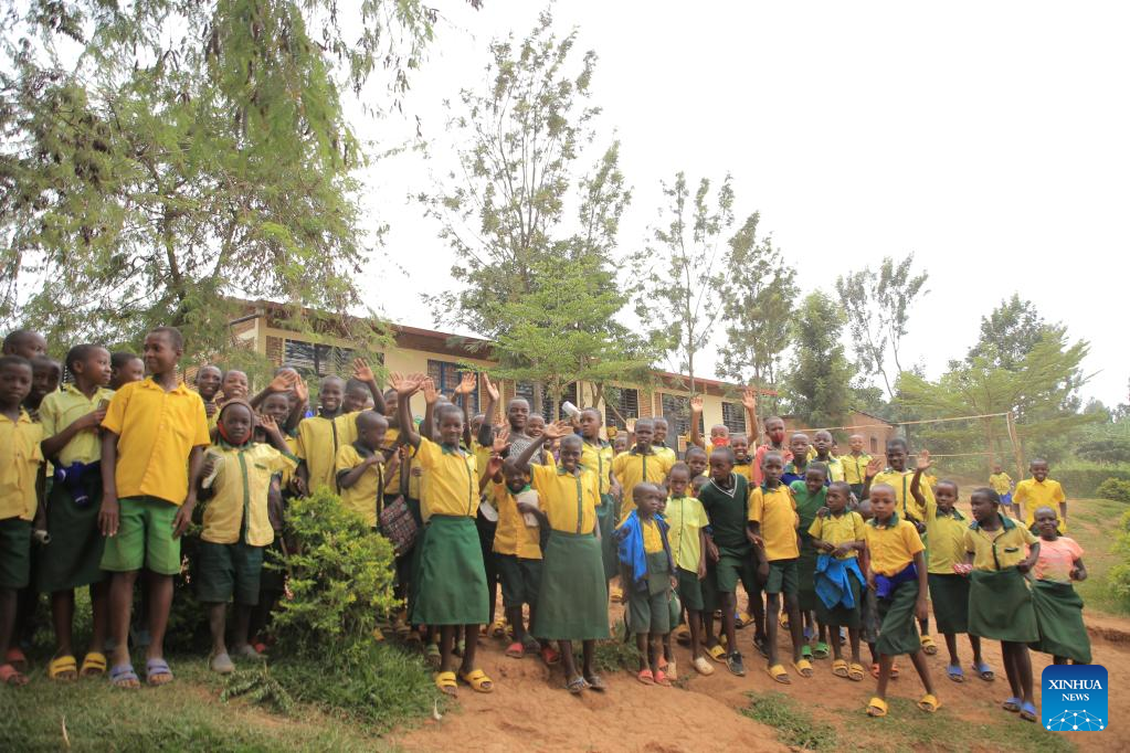 Students wave hands to welcome journalists at Tanda primary and secondary school (GS Tanda) in Rwanda, May 27, 2022. (Xinhua/Ji Li)