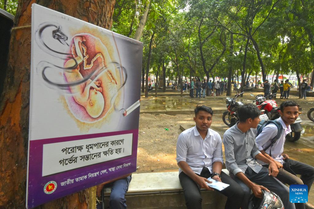 Young people sit next to an anti-tobacco awareness poster during the World No Tobacco Day in Dhaka, Bangladesh, on May 31, 2022. The World No Tobacco Day is observed every year on May 31. This year's theme "Tobacco: Threat to our environment" gives people one more reason to quit by demonstrating the environmental impacts of tobacco. (Xinhua)
