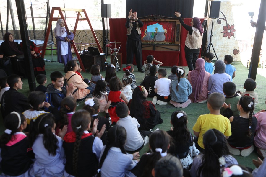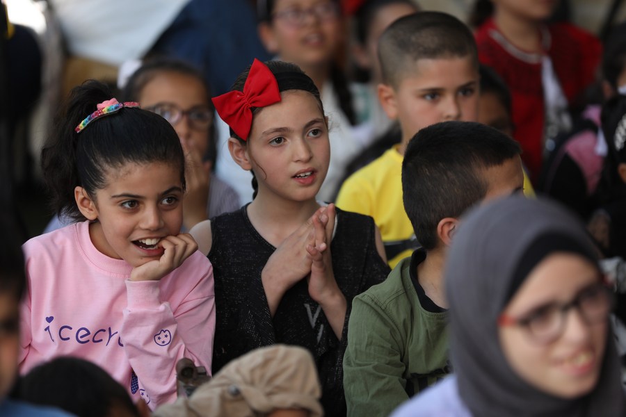 Palestinian children watch a puppet show in the Yatta village, south of the West Bank city of Hebron, on May 19, 2022. (Photo by Mamoun Wazwaz/Xinhua)