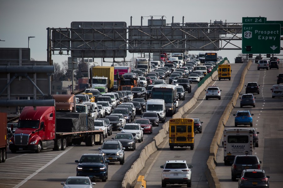 Vehicles drive along the Gowanus Expressway in the Brooklyn borough of New York, the United States, on March 8, 2022. (Photo by Michael Nagle/Xinhua)