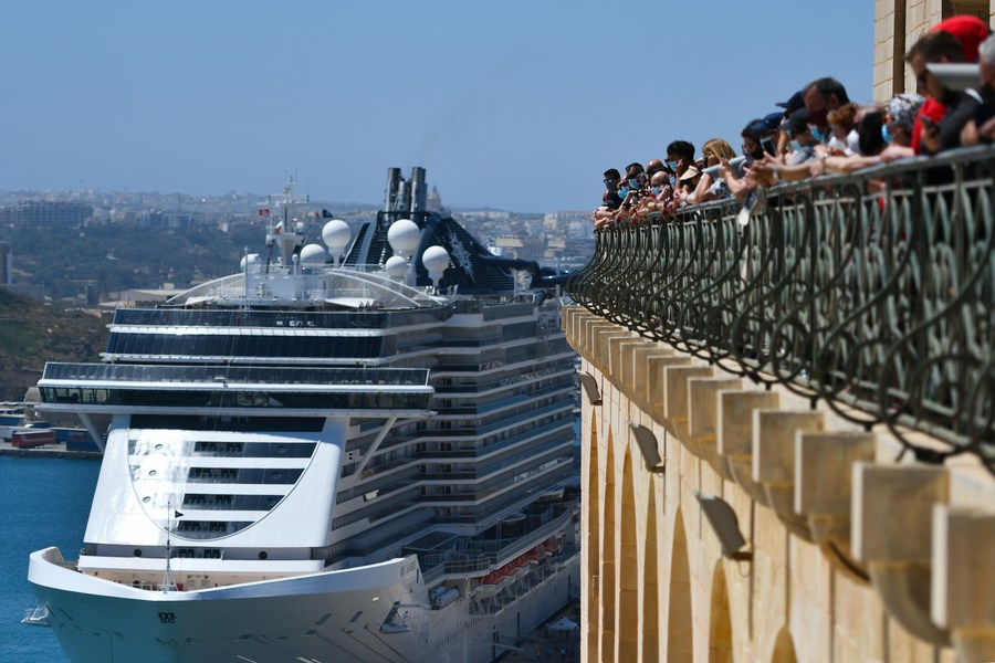 People watch as a cruise liner docks at Valletta's Grand Harbour in Valletta, Malta, on May 10, 2021. (Photo by Jonathan Borg/Xinhua)