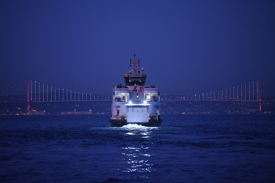 A cruise ship sails on the Bosporus Strait in Istanbul, Turkey, April 13, 2022. (Xinhua/Shadati)