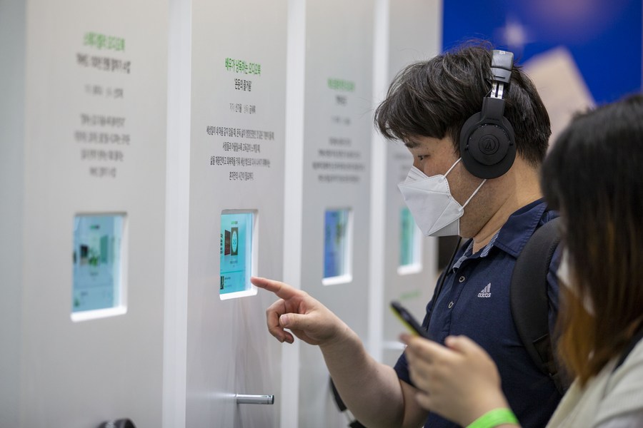A man listens to audiobooks at the Seoul International Book Fair in Seoul, South Korea, June 1, 2022. (Xinhua/Wang Yiliang)