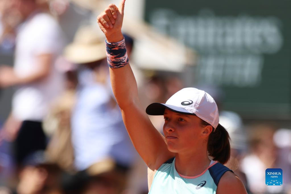 Iga Swiatek of Poland reacts after the women's singles quarterfinal against Jessica Pegula of the United States at the French Open tennis tournament at Roland Garros in Paris, France, June 1, 2022. (Xinhua/Gao Jing)