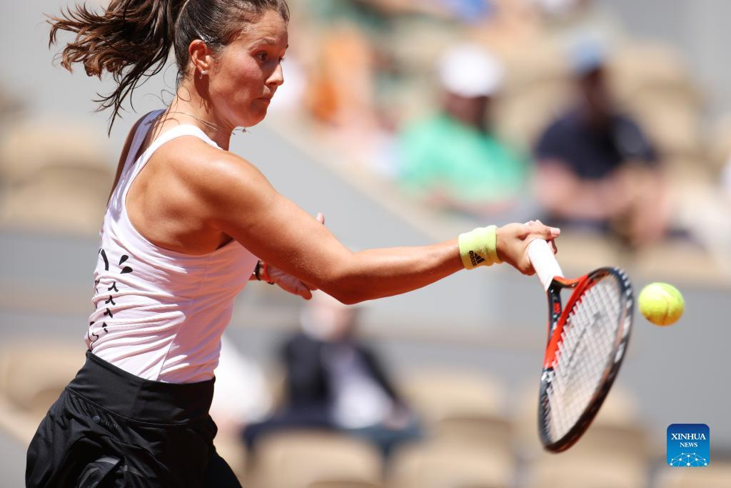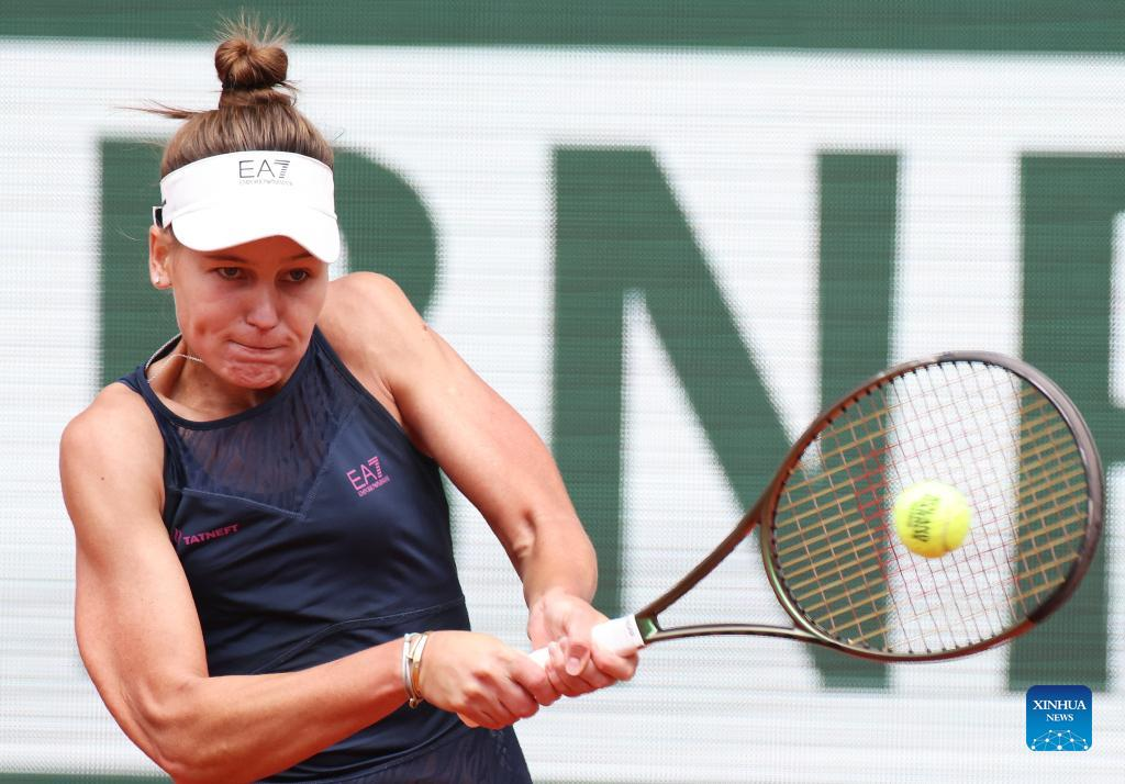 Daria Kasatkina of Russia hits a return during the women's singles quarterfinal against her compatriot Veronika Kudermetova at the French Open tennis tournament at Roland Garros in Paris, France, June 1, 2022. (Xinhua/Gao Jing)