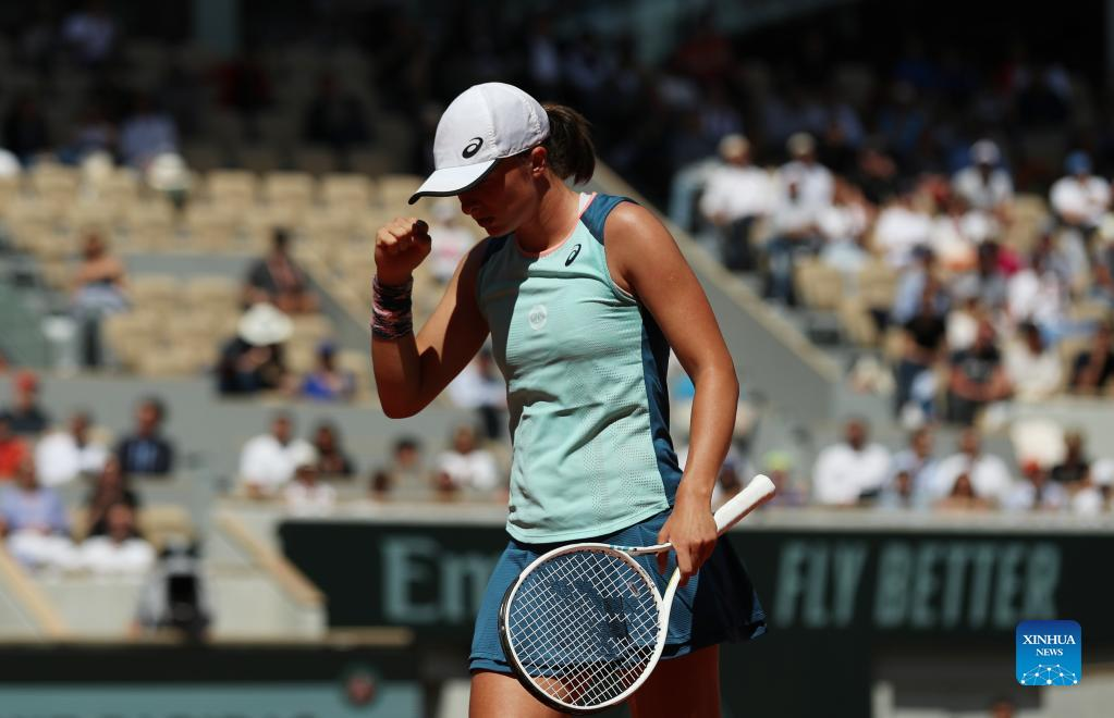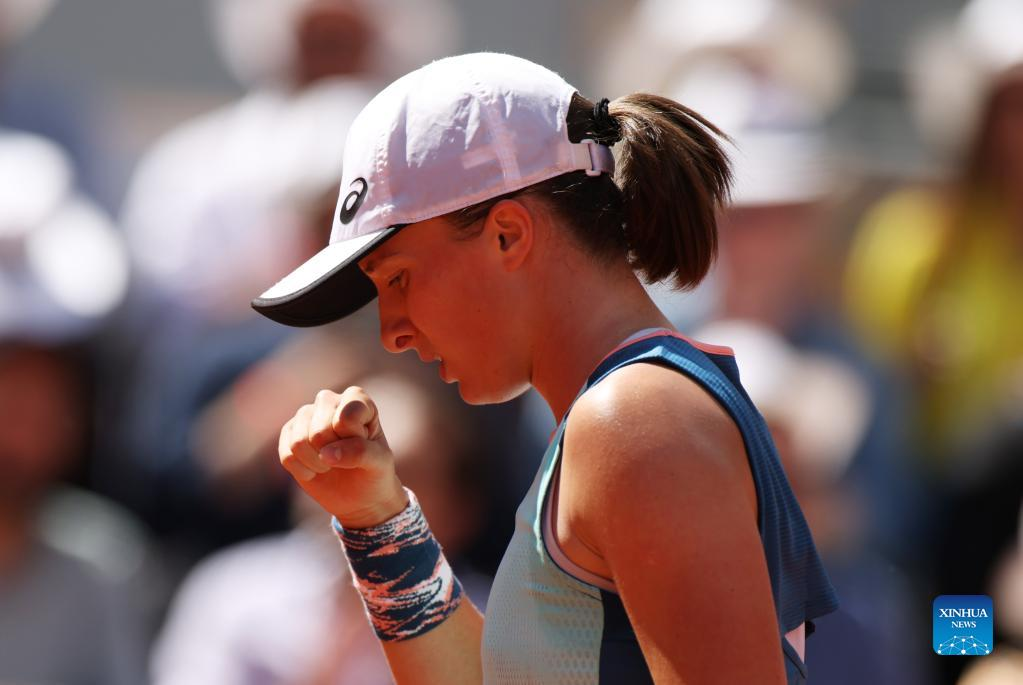 Iga Swiatek of Poland reacts during the women's singles quarterfinal against Jessica Pegula of the United States at the French Open tennis tournament at Roland Garros in Paris, France, June 1, 2022. (Xinhua/Gao Jing)