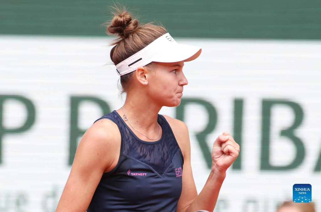 Veronika Kudermetova of Russia hits a return during the women's singles quarterfinal against her compatriot Daria Kasatkina at the French Open tennis tournament at Roland Garros in Paris, France, June 1, 2022. (Xinhua/Gao Jing)
