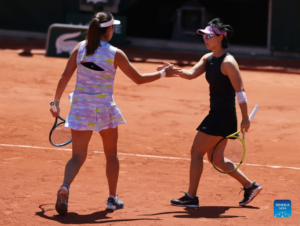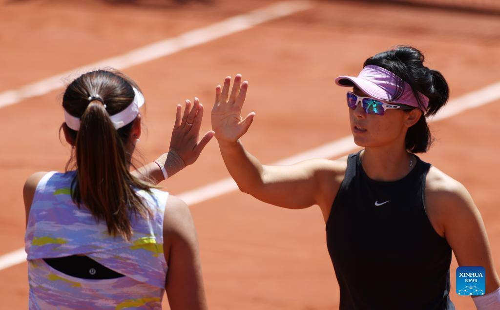 Xu Yifan (R)/Yang Zhaoxuan of China celebrate during women's doubles quarterfinal against Kristina Mladenovic/Caroline Garcia of France at the French Open tennis tournament at Roland Garros in Paris, France, June 1, 2022. (Xinhua/Gao Jing)