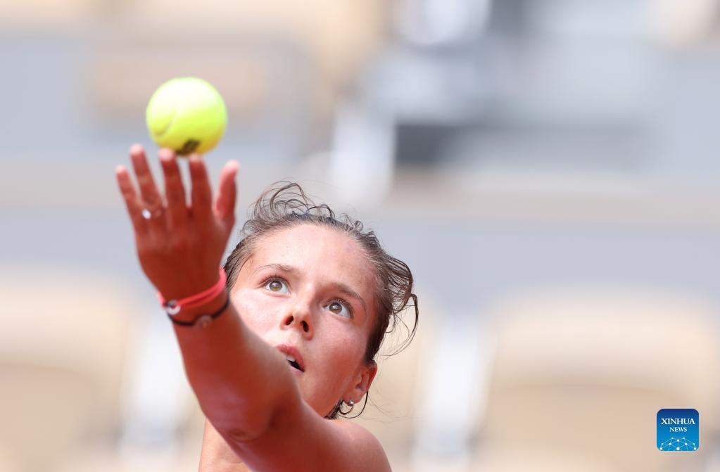 Daria Kasatkina of Russia serves during the women's singles quarterfinal against her compatriot Veronika Kudermetova at the French Open tennis tournament at Roland Garros in Paris, France, June 1, 2022. (Xinhua/Gao Jing)