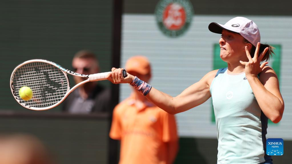 Iga Swiatek of Poland hits a return during the women's singles quarterfinal against Jessica Pegula of the United States at the French Open tennis tournament at Roland Garros in Paris, France, June 1, 2022. (Xinhua/Gao Jing)