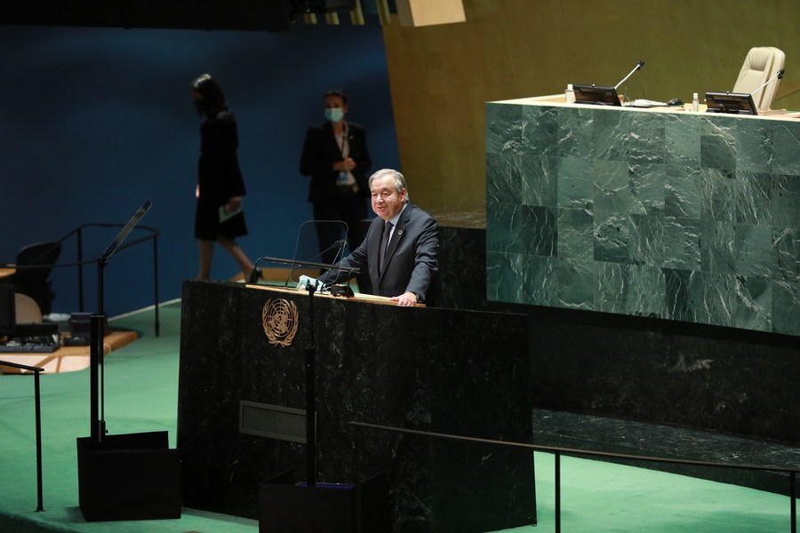 United Nations Secretary-General Antonio Guterres (front) speaks at the second SDG Moment, a high-level event to galvanize global action toward the 2030 Agenda in the General Assembly Hall at the UN headquarters in New York, on Sept. 20, 2021. (Xinhua/Xie E)
