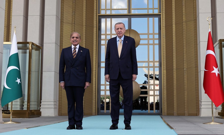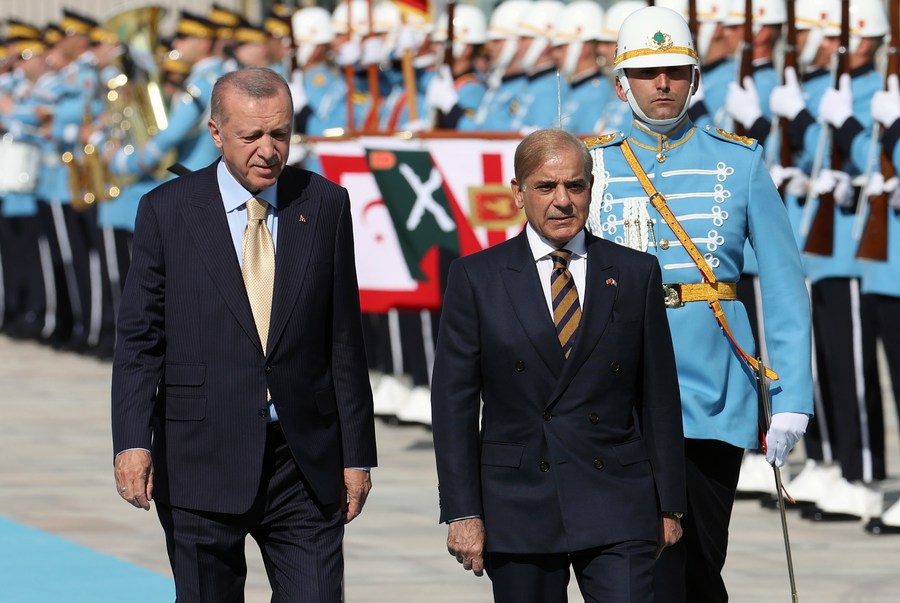 Turkish President Recep Tayyip Erdogan (L, Front) welcomes Pakistani Prime Minister Shehbaz Sharif (R, Front) in Ankara, Turkey, on June 1, 2022. (Photo by Mustafa Kaya/Xinhua)
