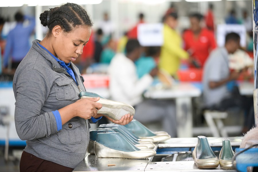 This file photo shows a worker operating on the production line of Huajian Shoe factory about 40 km south of Addis Ababa, capital of Ethiopia, on Oct. 18, 2016. (Xinhua/Michael Tewelde)