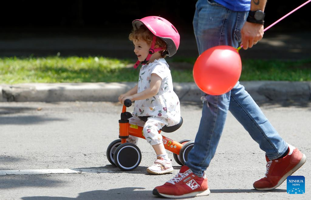 Children participate in a parade of little cyclists during an event marking International Children's Day in Bucharest, Romania, on June 1, 2022. (Photo by Cristian Cristel/Xinhua)