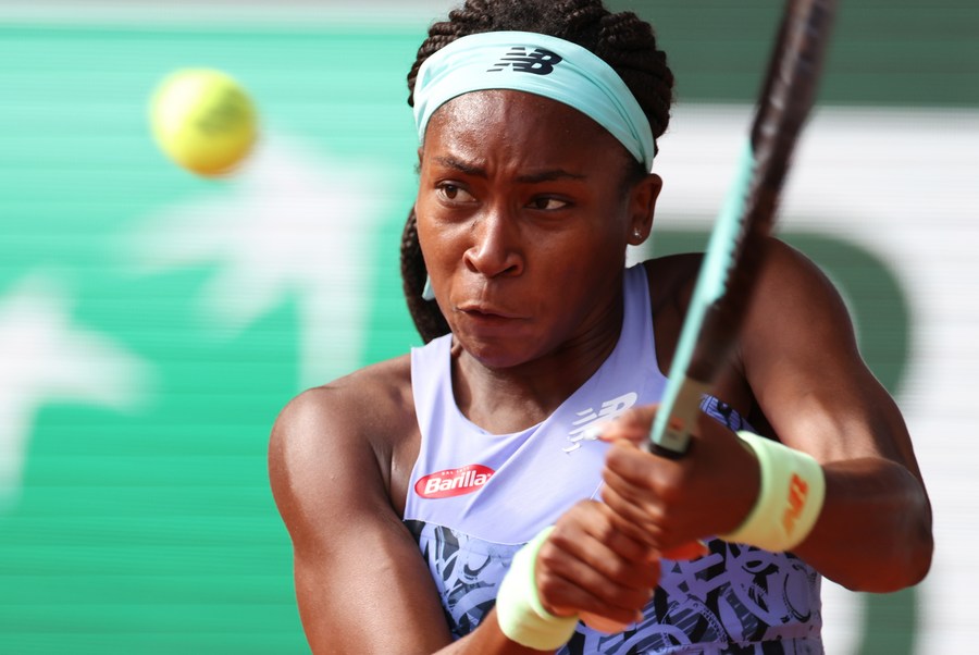 Coco Gauff of the United States hits a return during the women's singles semifinal against Martina Trevisan of Italy in the French Open tennis tournament at Roland Garros in Paris, France on June 2, 2022. (Xinhua/Gao Jing)
