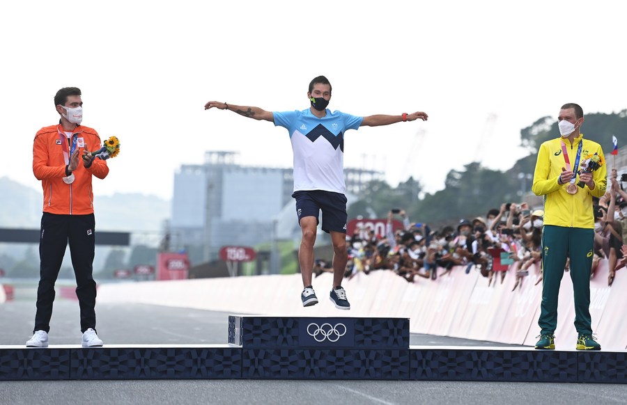 Dumoulin celebrates after winning the Tokyo 2020 cycling road men's individual time trial. (Xinhua/He Changshan)