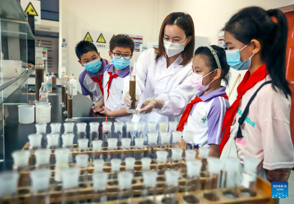 Children learn about the sewage test methods at a sewage treatment plant in Zunhua, north China's Hebei Province, June 4, 2022. Various events are held to raise people's awareness of environmental protection in China ahead of the World Environment Day, which falls on June 5. (Photo by Liu Mancang/Xinhua)