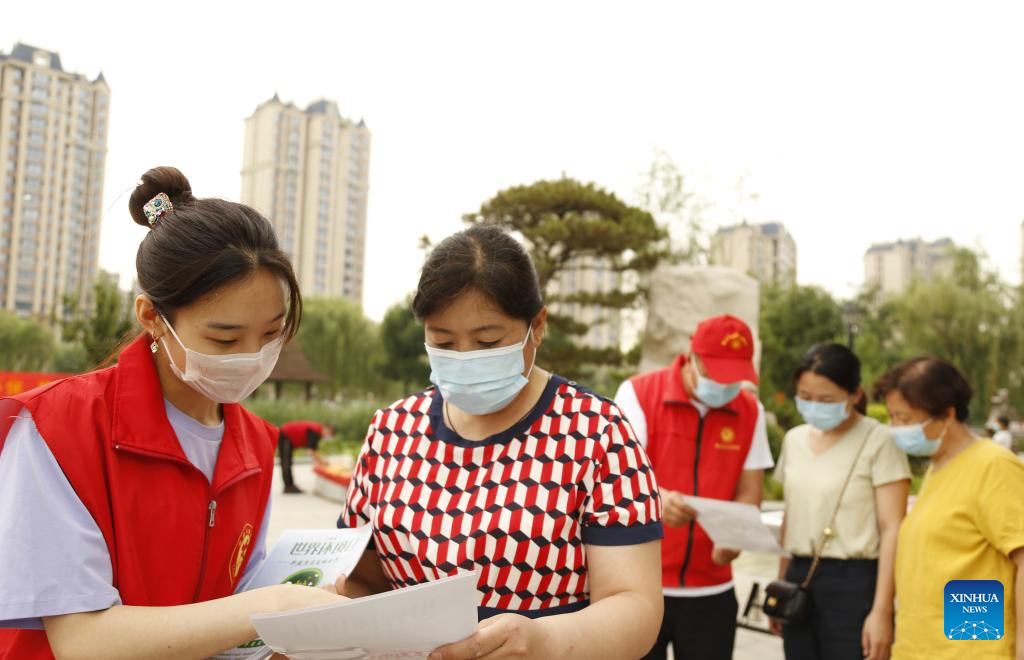 Volunteers promote environmental protection knowledge in Xiangdu District of Xingtai, north China's Hebei Province, June 4, 2022. Various events are held to raise people's awareness of environmental protection in China ahead of the World Environment Day, which falls on June 5. (Photo by Zhang Chi/Xinhua)