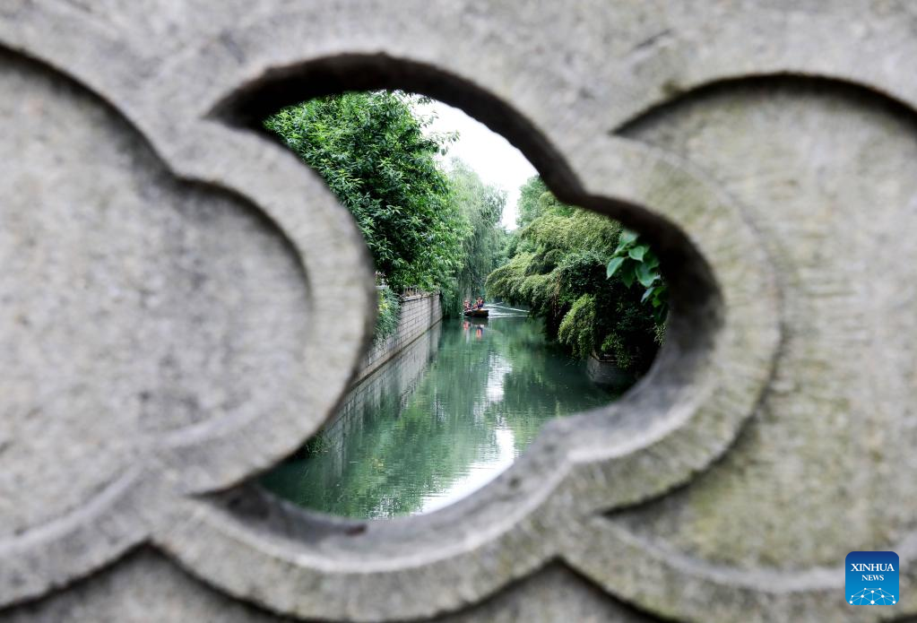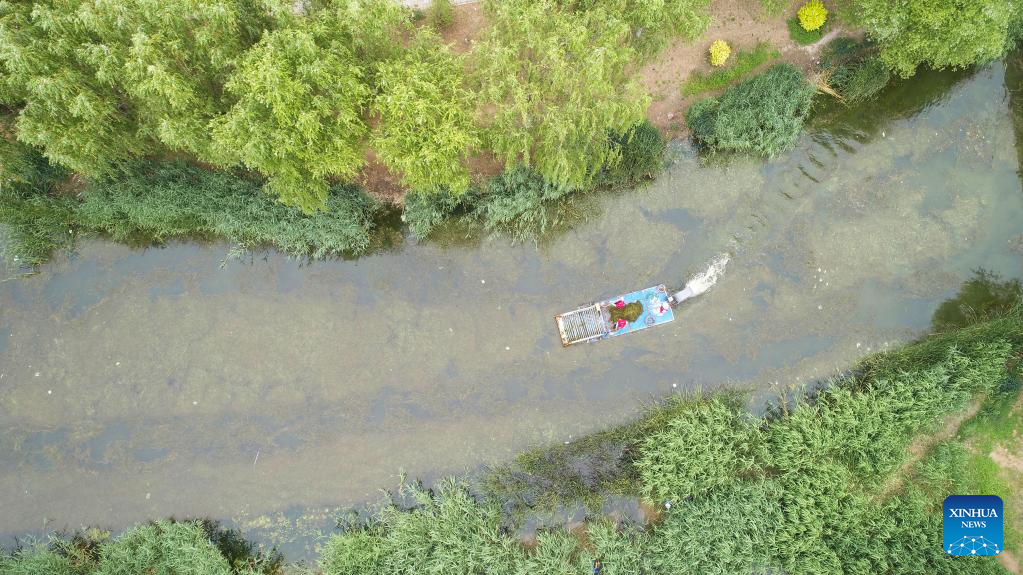 Sanitary workers collect floats on a river in Suzhou, east China's Jiangsu Province, June 4, 2022. Various events are held to raise people's awareness of environmental protection in China ahead of the World Environment Day, which falls on June 5. (Photo by Hang Xingwei/Xinhua)