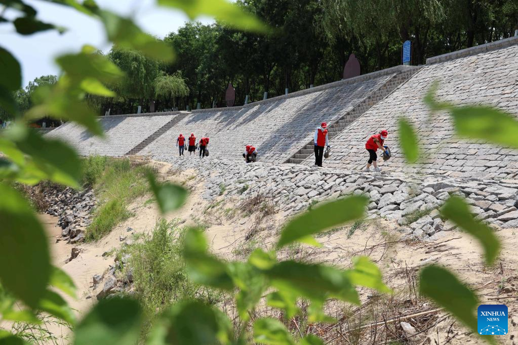 Volunteers collect wastes at the bank of Yellow River in Boxing County of Binzhou, east China's Shandong Province, June 4, 2022. Various events are held to raise people's awareness of environmental protection in China ahead of the World Environment Day, which falls on June 5. (Photo by Chu Baorui/Xinhua)