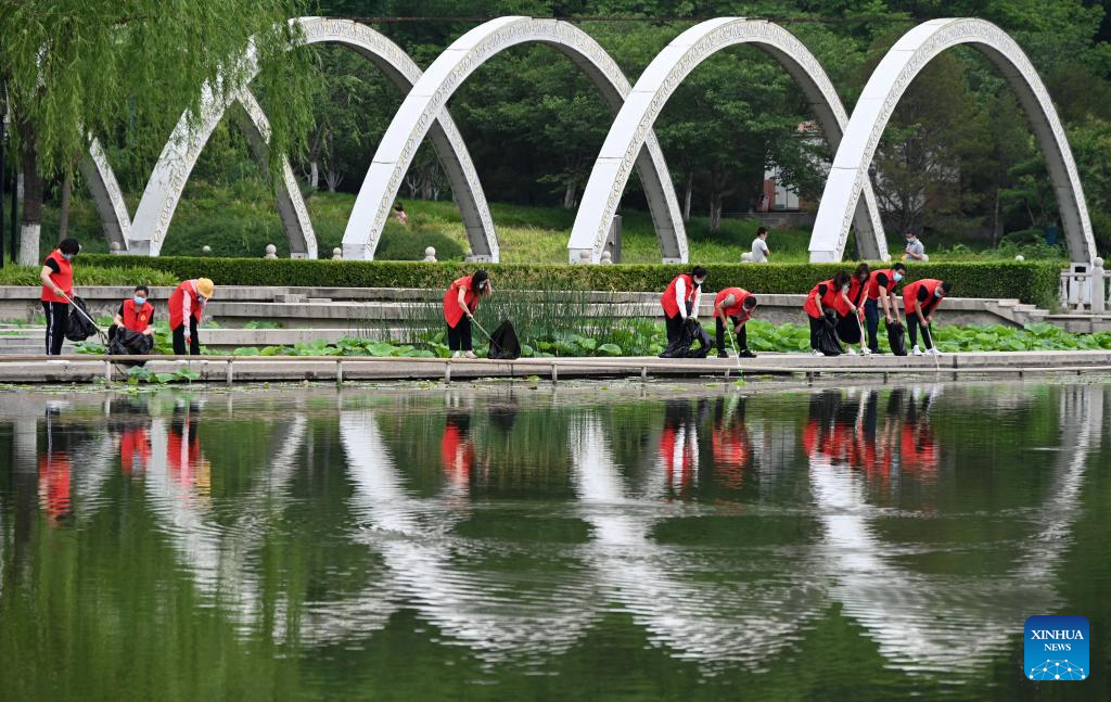 Volunteers collect wastes at a park in Congtai District of Handan, north China's Hebei Province, June 4, 2022. Various events are held to raise people's awareness of environmental protection in China ahead of the World Environment Day, which falls on June 5. (Photo by Hao Qunying/Xinhua)