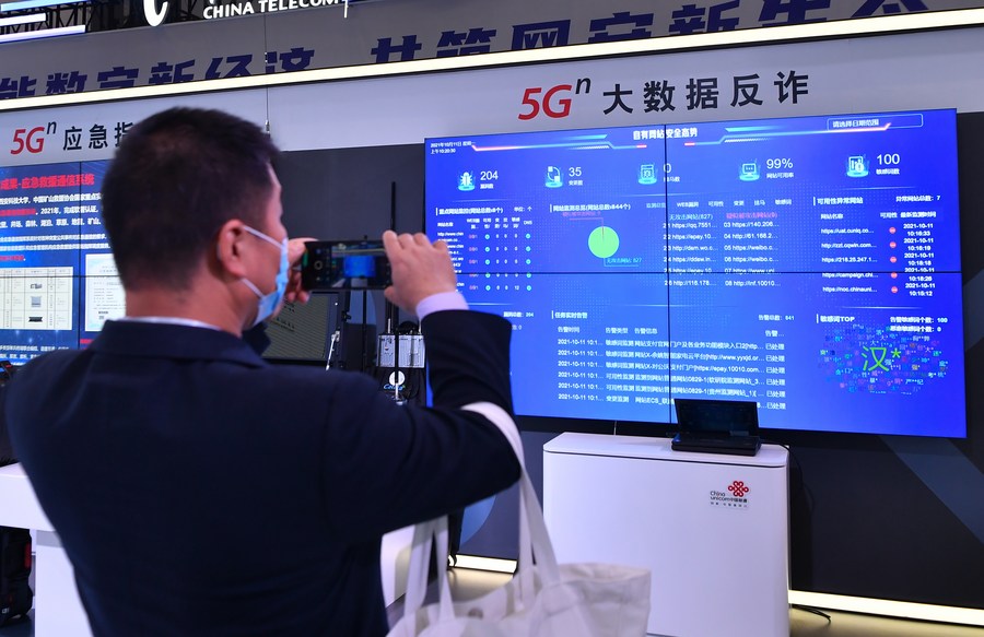 A visitor takes photo at the cybersecurity expo of 2021 China Cybersecurity Week in Xi'an, capital of northwest China's Shaanxi Province, Oct. 11, 2021. (Xinhua/Zhang Bowen)
