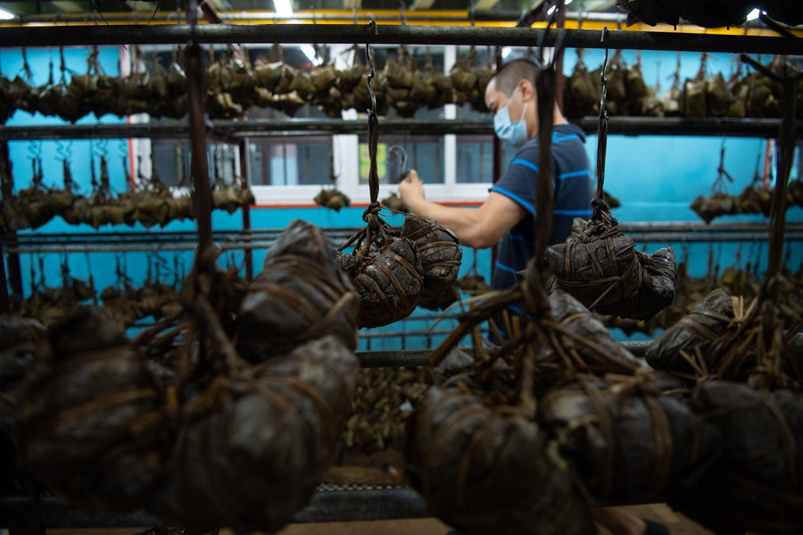 An employee of Lan Heong Kuok, a Cantonese tea house, puts Zongzi on rows of iron racks for display in Macao, south China, May 31, 2022. (Xinhua/Cheong Kam Ka)