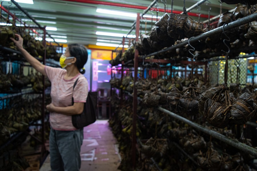 A local resident buys Zongzi at Lan Heong Kuok, a Cantonese tea house, in Macao, south China, May 31, 2022. (Xinhua/Cheong Kam Ka)