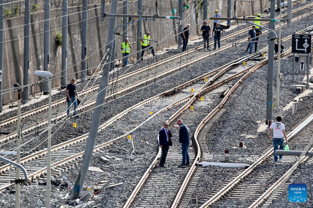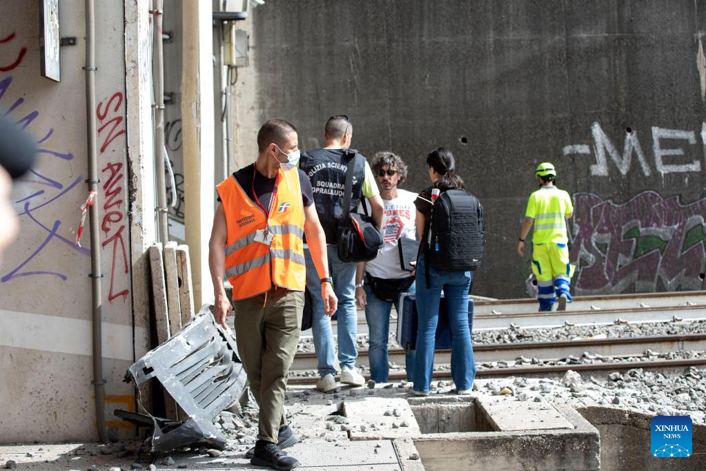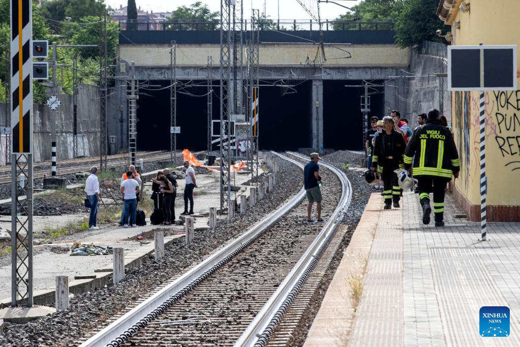 People work after a train accident in Rome, Italy, on June 3, 2022. A high-speed train connecting Italy's northern city of Turin and the southern port city of Naples had an accident in a tunnel in Rome on Friday afternoon, local police said. According to news reports, the last car of a train that carried about 250 passengers derailed while approaching Roma Termini, the city's main railway station. There were no serious injuries, and police said the passengers were evacuated and offered alternative transportation without major incidents. (Xinhua)