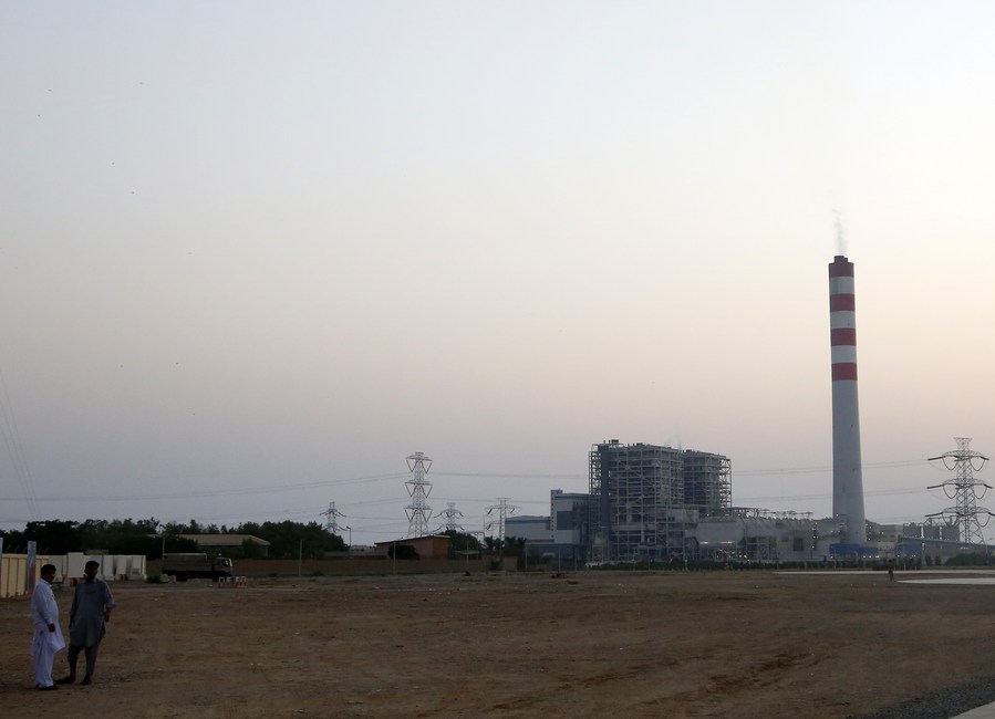 Photo taken on Oct. 21, 2019 shows local residents stand outside a power plant in Hub, Pakistan. (Xinhua/Ahmad Kamal)