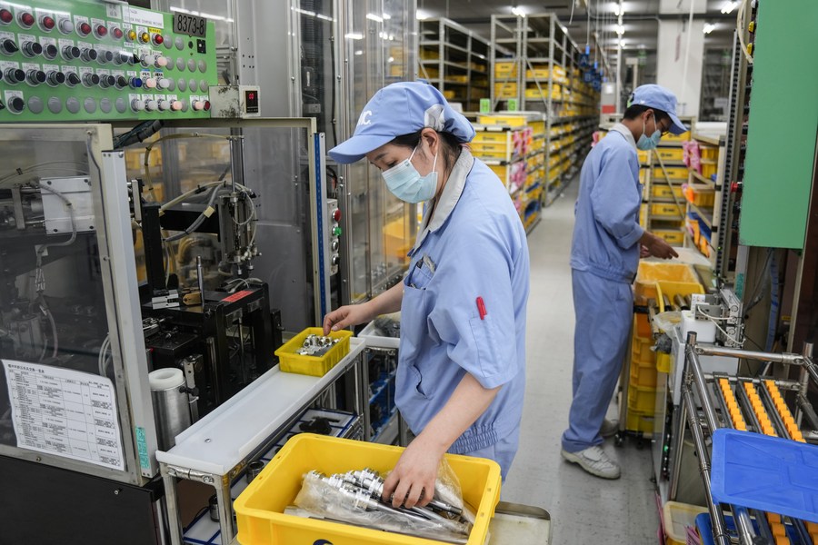 Staff members work at a factory of SMC Corporation in Beijing Economic-Technological Development Area of Beijing, capital of China, June 4, 2022. (Xinhua/Peng Ziyang)