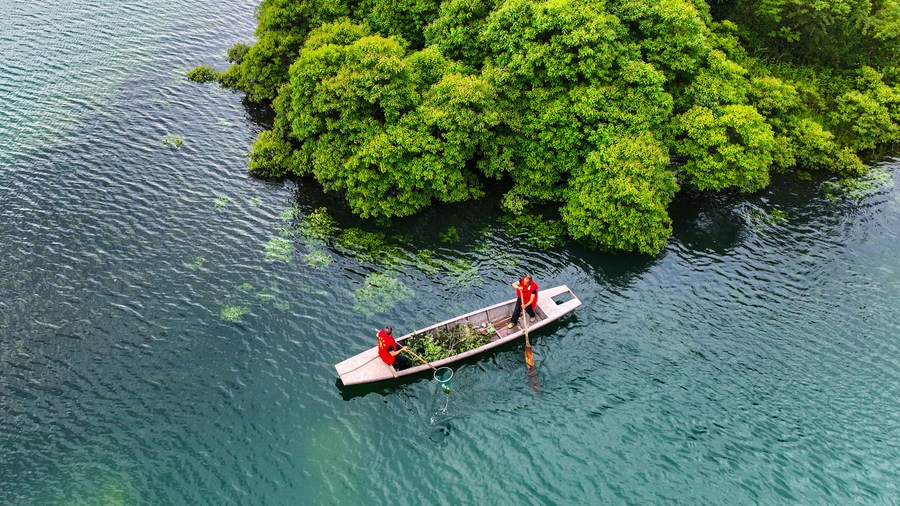 Aerial photo taken on June 4, 2022 shows volunteers cleaning at the Yangquan reservoir in Changning City, central China's Hunan Province. (Photo by Zhou Xiuyuchun/Xinhua)
