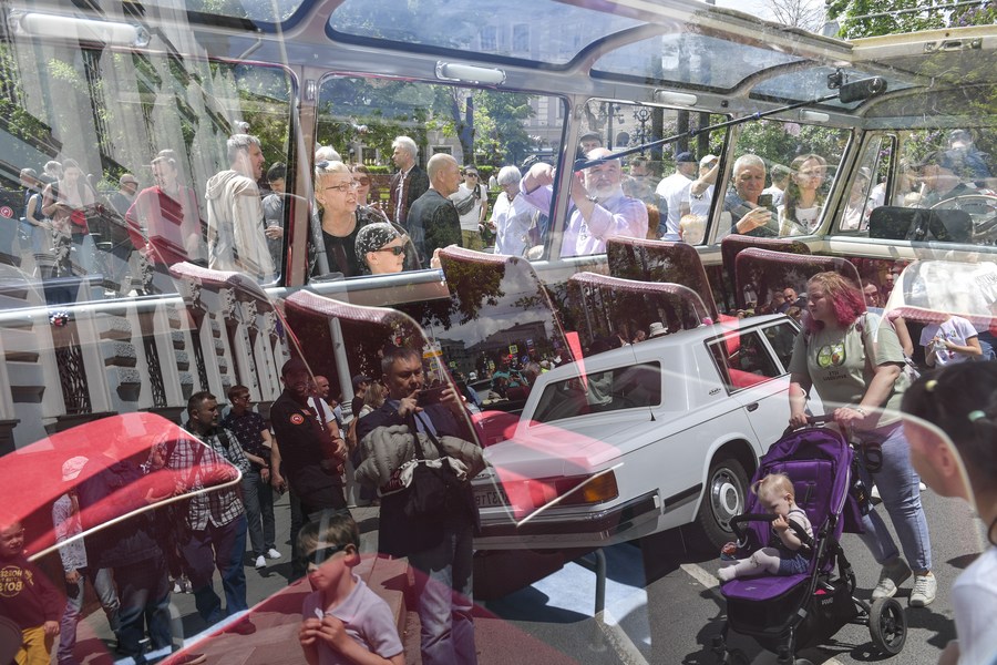 People look at retro cars on display during a retro vehicles parade in Moscow, Russia, on June 4, 2022. (Photo by Alexander Zemlianichenko Jr/Xinhua)■