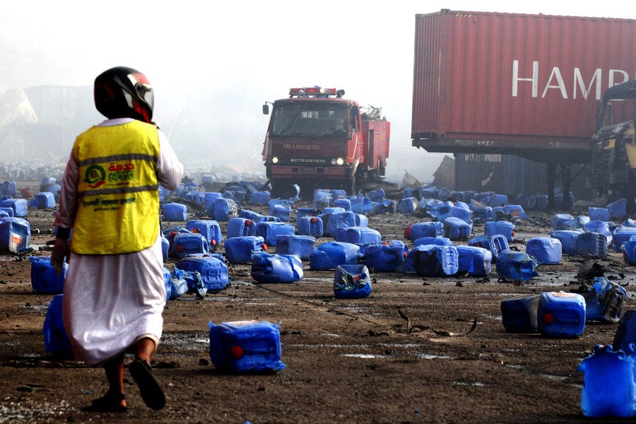 A volunteer looks for injured people at the fire site of a container depot in Chattogram, Bangladesh on June 5, 2022. At least 14 people were killed and 187 others injured after a private container depot caught fire on Saturday night in Bangladesh's Chattogram district, some 242 km southeast of capital Dhaka, a senior official said on Sunday. (Xinhua)