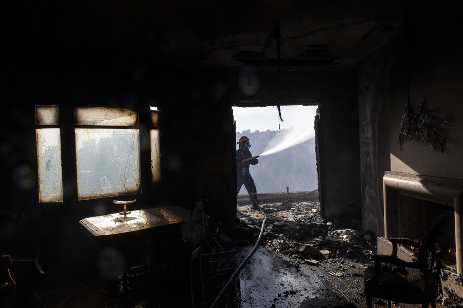 A firefighter battles a fire outside a house in Voula, a southern suburb of Athens, Greece, on June 4, 2022. A major wildfire broke out on Saturday afternoon in the southern coastal part of Athens, prompting a large response from the fire service as the blaze was reaching residential areas. (Xinhua/Marios Lolos)