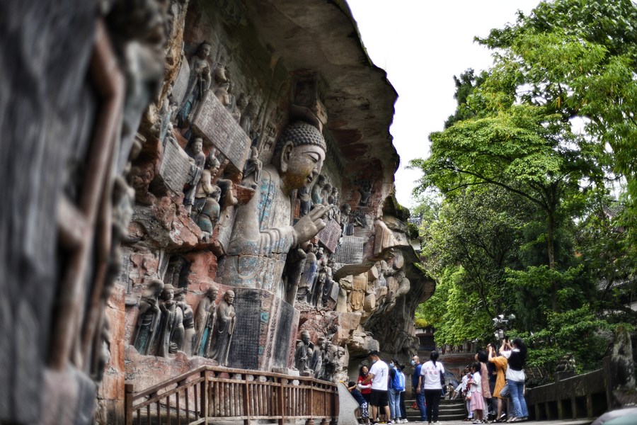 Tourists visit Dazu Rock Carvings at Dazu District of southwest China's Chongqing, June 5, 2022. (Xinhua/Liu Chan)