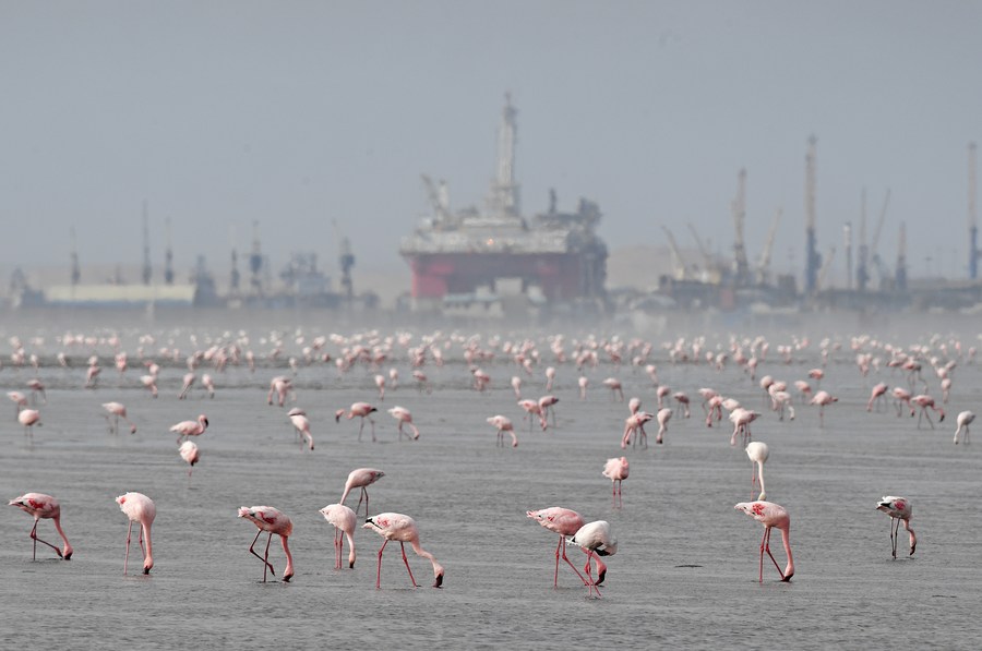 Flamingos are seen at Walvis Bay in Namibia, June 5, 2022. (Xinhua/Chen Cheng)