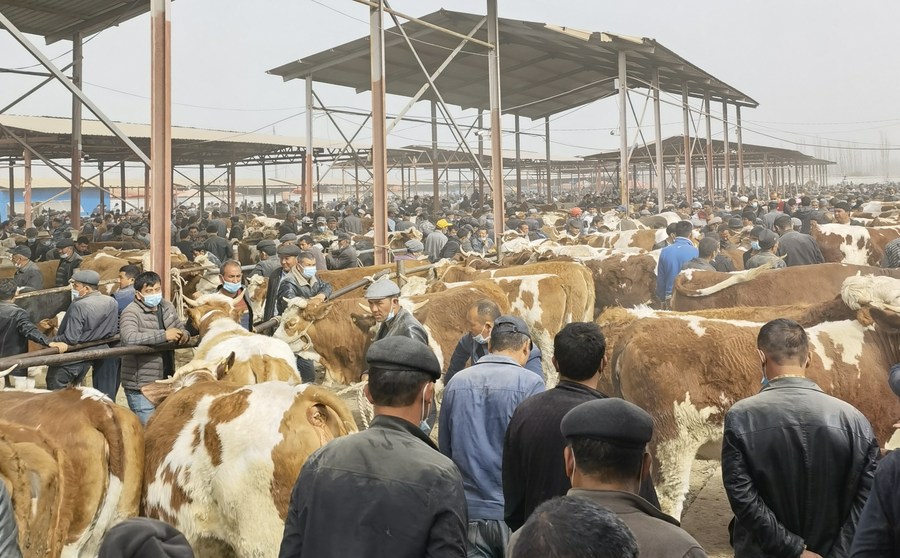 Photo taken on March 22, 2022 shows a view of the "flocks and herds" bazaar in northwest China's Xinjiang Uygur Autonomous Region. (Xinhua/He Jun)