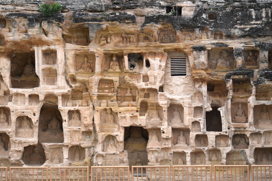 Photo taken on May 26, 2022 shows a view of the North Grotto Temple in Qingyang, northwest China's Gansu Province. The North Grotto Temple in Qingyang consists of 308 ancient Buddhist caves that date back to the early sixth century. Featuring more than 2,000 statues, the site is considered as a vault of art in Chinese Buddhism. (Xinhua/Chen Bin)