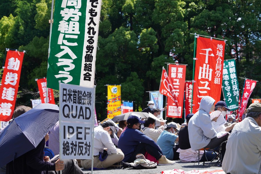Protesters gather at Shiba Park to demonstrate against the upcoming U.S.-Japan summit and the summit of the Quadrilateral Security Dialogue (Quad), in Tokyo, Japan, May 22, 2022. (Xinhua/Zhang Xiaoyu)