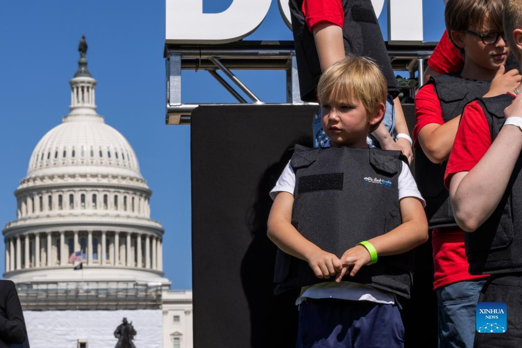 Students wearing bulletproof vests hold a rally near the Capitol Reflecting Pool in Washington, D.C., the United States, June. 6, 2022. A group of student activists gathered in Washington, D.C. on Monday afternoon, calling for actions from U.S. politicians in the wake of mass shootings over the past few weeks. (Photo by Aaron Schwartz/Xinhua)
