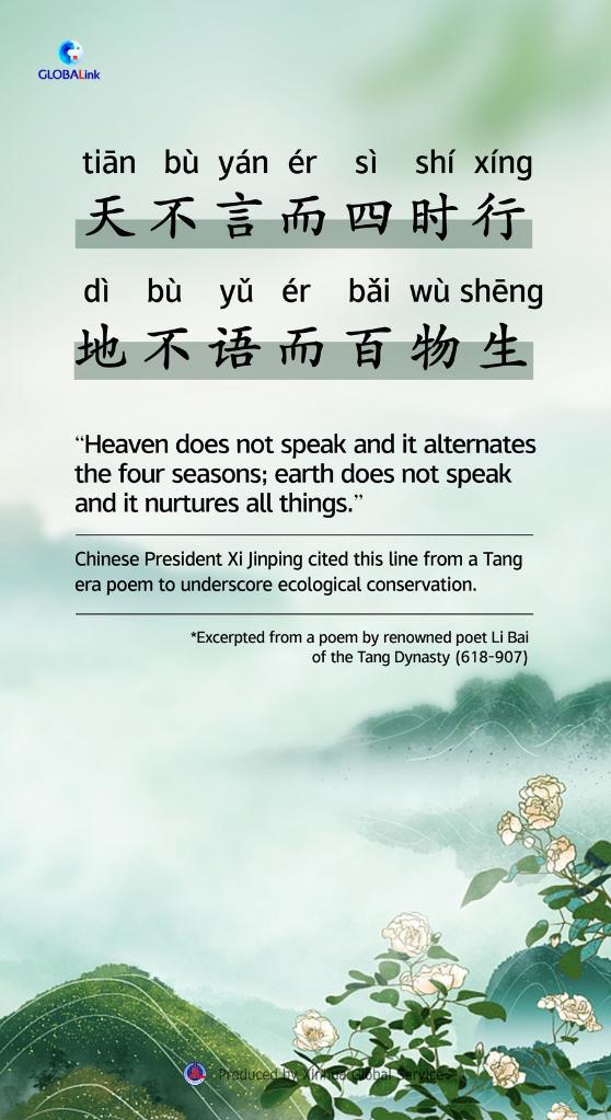 BEIJING, June 7 (Xinhua) -- "Heaven does not speak and it alternates the four seasons; earth does not speak and it nurtures all things." Chinese President Xi Jinping has quoted this line from a Tang era poem on multiple occasions to underscore ecological conservation.