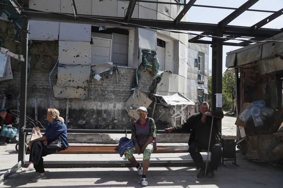 People sit in front of a damaged residential building in the port city of Mariupol, May 30, 2022. (Photo by Victor/Xinhua)