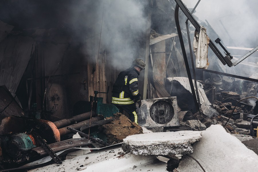 A fireman works on the debris of a destroyed building in Donetsk, May 27, 2022. (Photo by Diego Herrera/Xinhua)