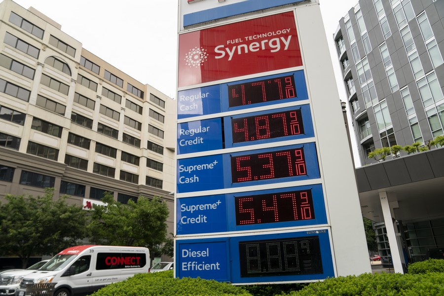Gas prices are displayed at a gas station in Washington, D.C., the United States, on May 11, 2022. (Xinhua/Liu Jie)