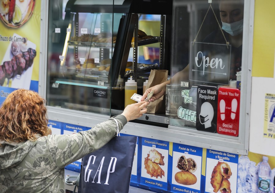 A woman buys food at a food truck in New York, the United States, May 11, 2022. (Xinhua/Wang Ying)
